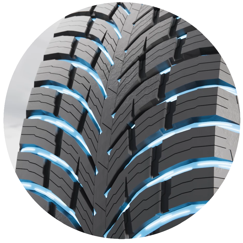Technologie Season Sense: Směrový multifunkční dezén a inovativní celoroční směs pryže zajišťují komfortní a bezstarostnou jízdu v každém ročním období.