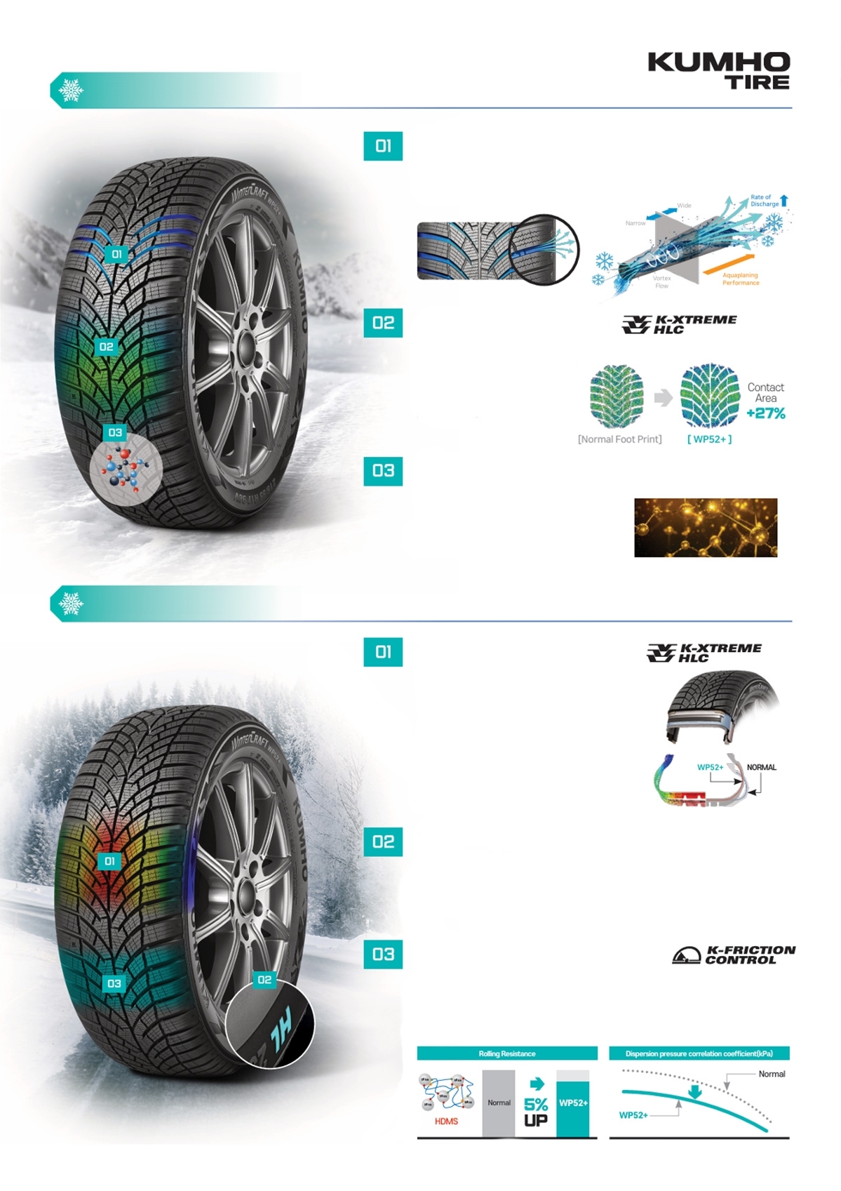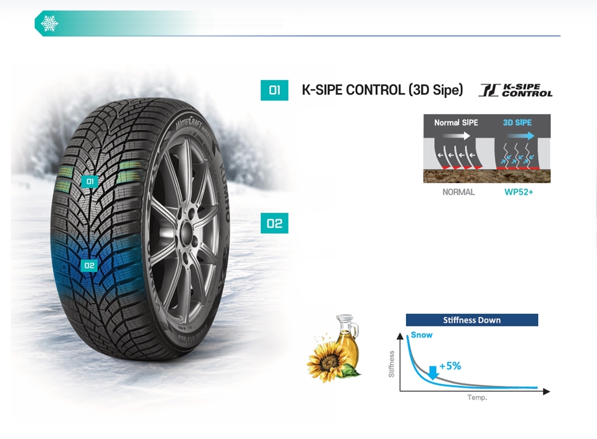 Zimní směs pneumatik Kumho obsahuje slunečnicový olej, který snižuje teplotu skelného přechodu oproti běžným letním směsím. Tím zůstává guma modelu WP52+ pružná i při nízkých teplotách, což zvyšuje přilnavost, stabilitu a bezpečnost na zasněžených a kluzkých vozovkách. O 5 % nižší tuhost při nízkých teplotách → lepší trakce a ovladatelnost.