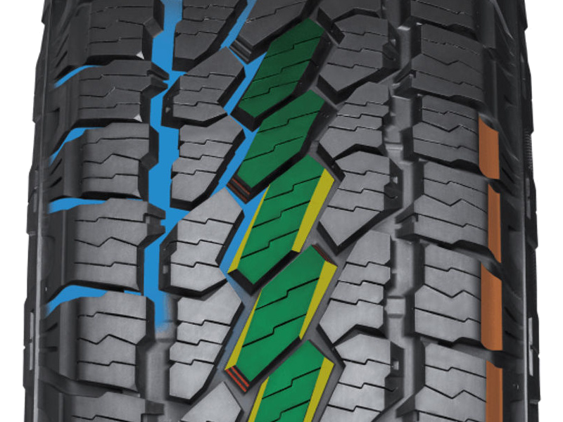 Moderní dezén do každého terénu se šestihrannými středovými bloky a obvodovým propojením v ramenní části a na bočnicích.